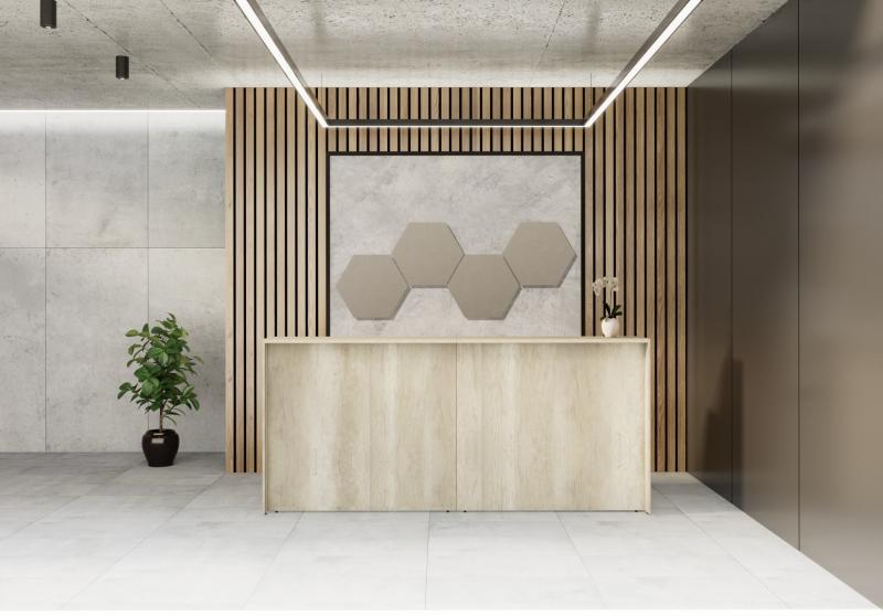Mostrador en "L"Recepción: Tapas 25mm - Laterales 18mm. Filos 2mm PVC colores: Blanco / Negro / Ceniza / Grafito / Helsinki / Teka Ártico / Carvalho Mezzo / Haya / Aluminio / Báltico