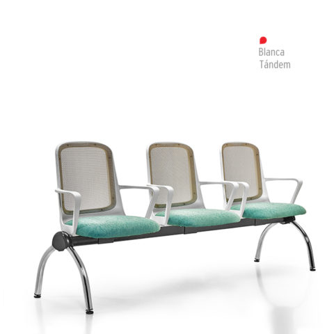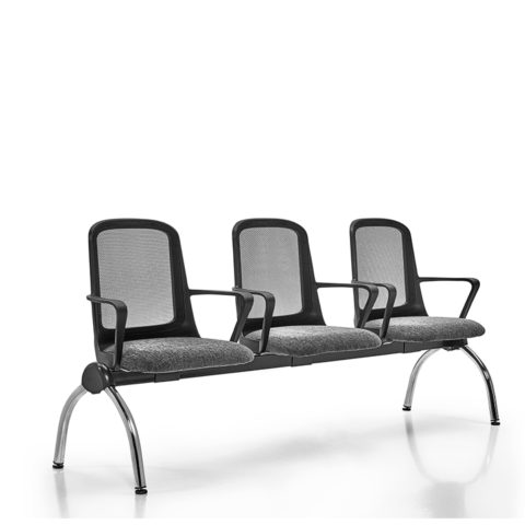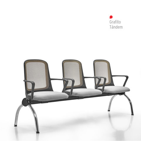 Opcionales: Módulos de 2, 3 y 4 puestos de asientos y mesas combinables. Plásticos en color: Blanco, gris grafito o negro. Estructura curva cromada o negra.